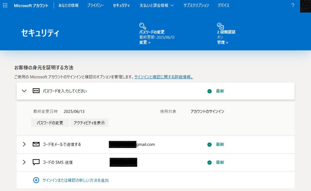 私はすでに他メールアドレスの認証と電話番号SMSの認証を登録してましたが、さらに認証アプリからの認証も追加しておきました。また、手書きのメモでパスワードと回復用コードを保管しておくことにしました。念のためスマホで写真で撮って保管も。これでばっちりだろう。あとはWindowsにサブのユーザーを追加しておいてもいいかもしれないですね。サブでログインできれば、パスワードの普及とかもできるかもしれないので。